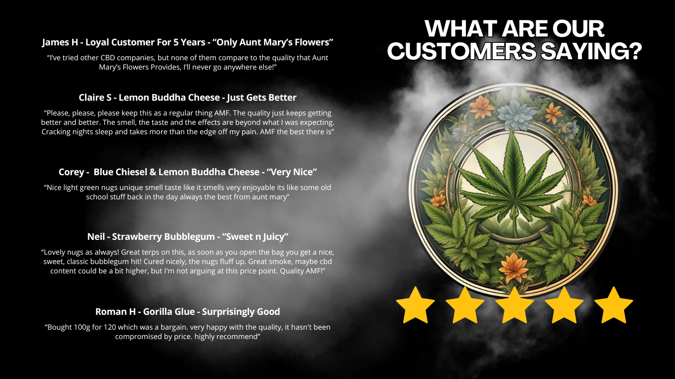 I’ve recently made the switch to CBD flower and I can’t recommend Aunt Mary’s enough! The website gives you great information on each of the products and what to expect, delivery has always been quick and discreet and the product itself is fantastic! Full of flavour and really enjoyable! As someone who has been smoking for 10+ years I can honestly say this is one of the best flowers I’ve purchased and I’ll definitely be a loyal customer of Aunt Mary’s for years to come! 10/10, keep up the good work guys!!